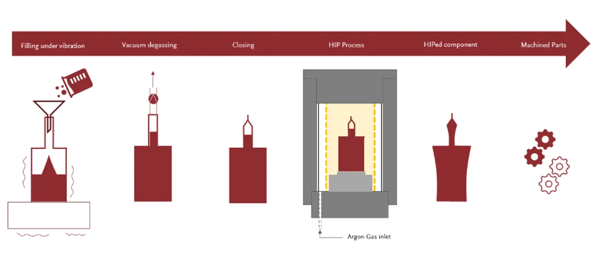 Wenn Bauteile mit dem HIP Verfahren behandelt werden, werden durch gleichzeitige Anwendung von Wärme und Druck, interne Hohlräume und Mikro-Porositäten durch eine Kombination aus plastischer Verformung, Fließen und Diffusionsbindung des Materials beseitigt. Das Pulver wird somit zu einem Feststoff verdichtet.